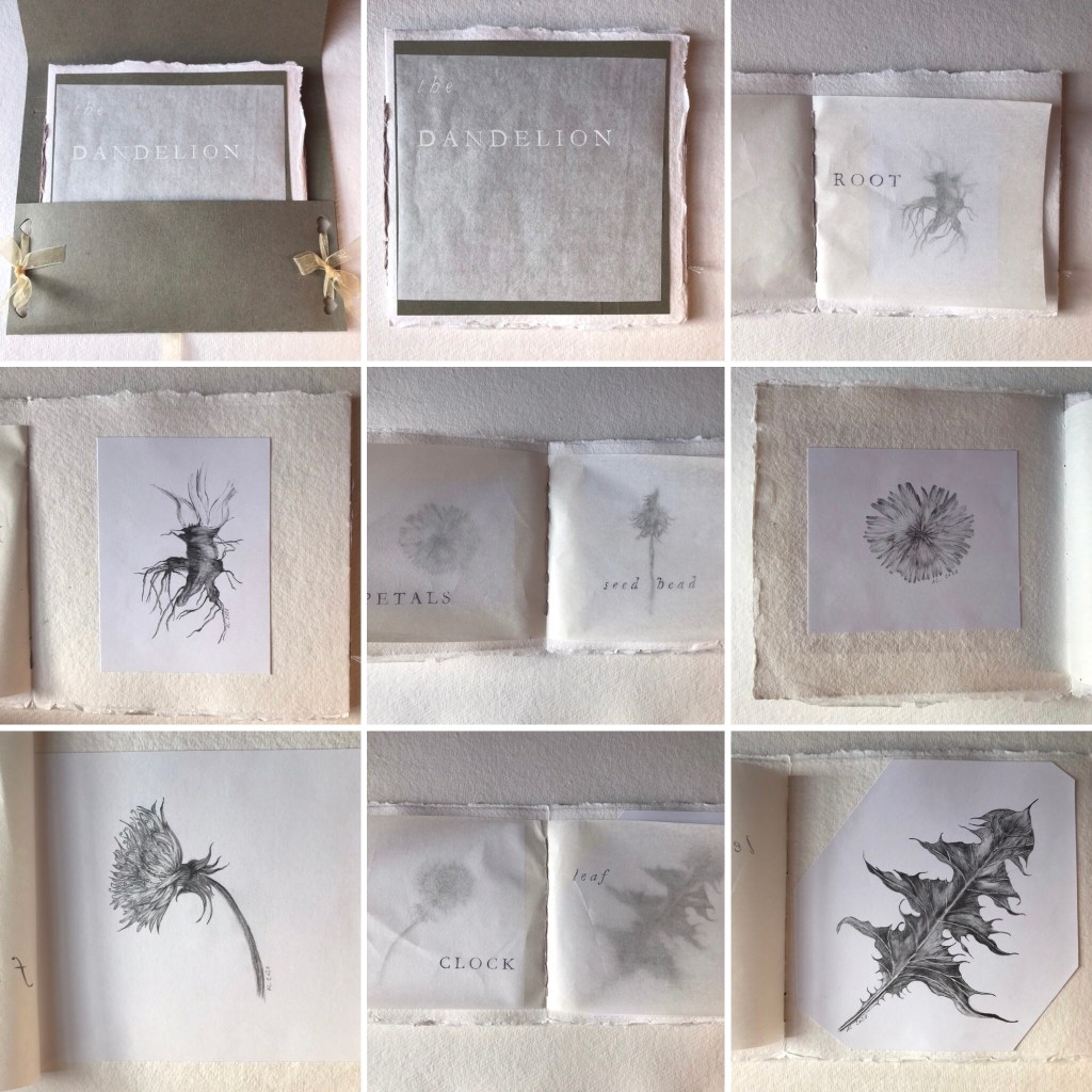 The book shows the different stages of the life of a dandelion, drawn in pencil during the summer of 2020, and made into the book in 2021.